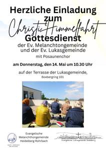 Auf der Terrasse des Ev. Gemeindezentrums der Lukasgemeinde feiern wir zusammen mit der Melanchthongemeinde aus Rohrbach Christi Himmelfahrt. Musikalisch wird der Gottesdienst vom Posaunenchor begleitet. Bei schlechtem Wetter kann in die Gemeinderäume ausgewichen werden.