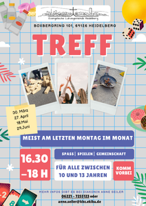 Einmal im Monat ist Zeit für den "Treff"! Ein Ort für alle, die im Sommer in die fünfte Klasse kommen oder zwischen 10 und 13 Jahren alt sind. Wir spielen, backen, kochen oder basteln und haben Zeit für einander. Kontaktperson: Diakonin Anne Seiler (anne.seiler@kbz.ekiba.de)
