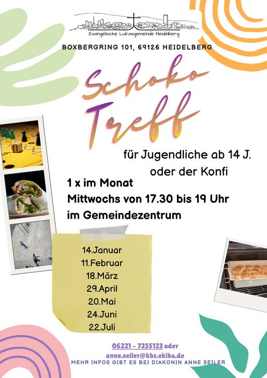Einmal im Monat findet in der Lukasgemeinde ein Treff für Jugendliche ab 14 Jahren statt. Wir spielen, backen oder essen zusammen. Wir treffen uns Mittwochs von 17.30 Uhr bis 19 Uhr.